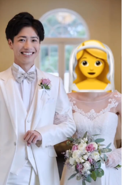 こちらも残念ながらスタンプで顔は隠されていますが、ウエディングドレス姿がスラっとしていて綺麗ですよね!