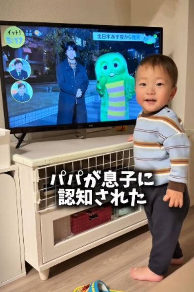 「やざぴん」コンビでテレビに映るパパの姿を見て「アパ!」(=パパ)と呼んでいる可愛い姿が撮影されていました。